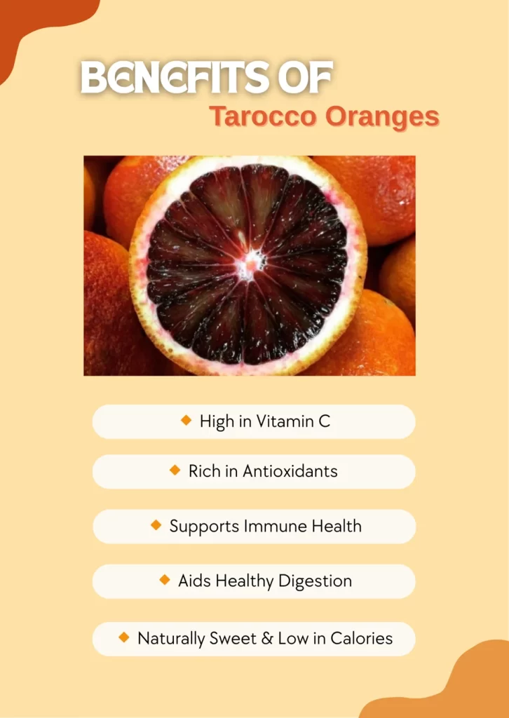 Tarocco oranges contain fiber, which helps your digestion stay on track. Fiber keeps your gut healthy, makes you feel full for longer, and supports overall digestive wellness. So, when you enjoy a Tarocco orange, you’re not just having a sweet snack, you’re also giving your body some natural goodness in the simplest way possible