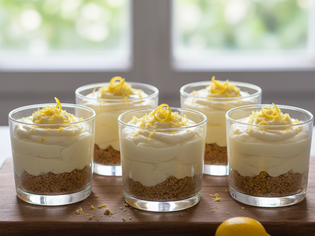 To begin, mix crushed biscuits with melted butter and press the mixture into small cups. Next, blend cream cheese, sugar, lemon juice, and zest until smooth. Spoon the filling over the biscuit base.