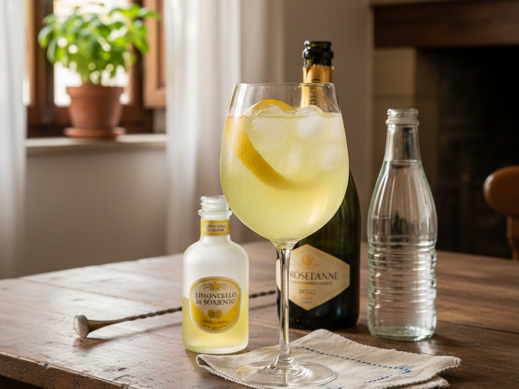 Fill a glass with ice. Then pour in limoncello, followed by Prosecco. Add a splash of sparkling water and gently stir. Garnish with a strip of fresh lemon peel.