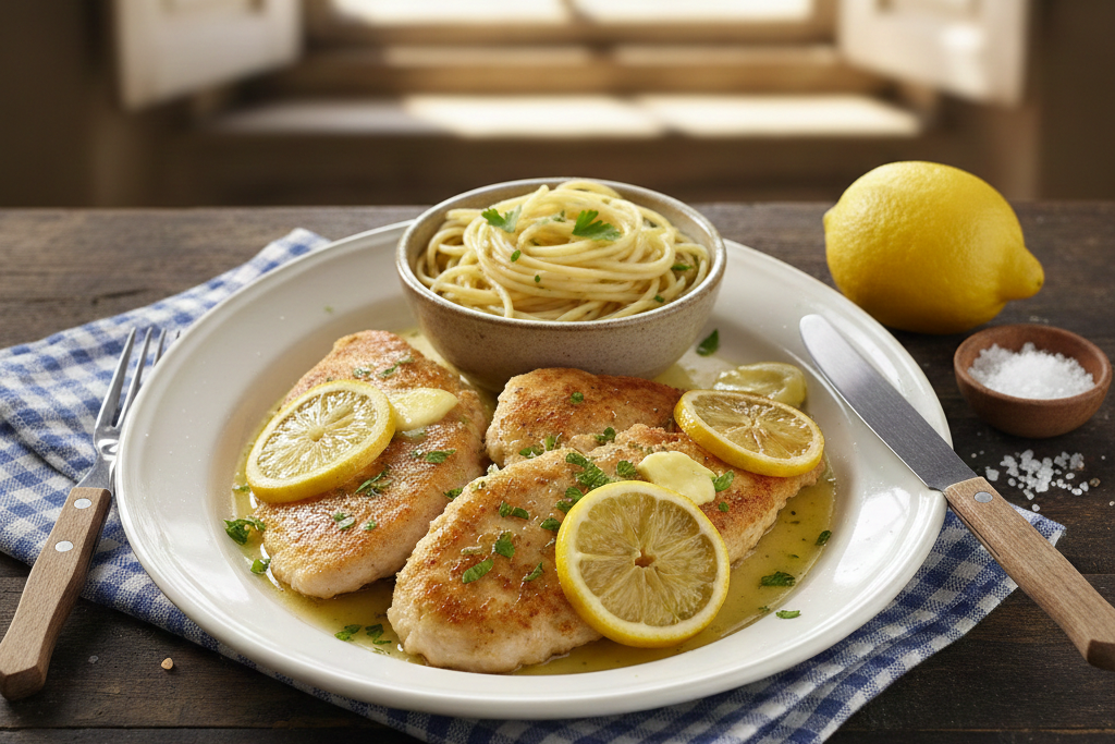 First, lightly coat the chicken in flour. Then cook it in a butter and olive oil mixture until golden brown. After that, add the lemon juice and slices directly into the pan. Let everything simmer gently until a glossy sauce forms.