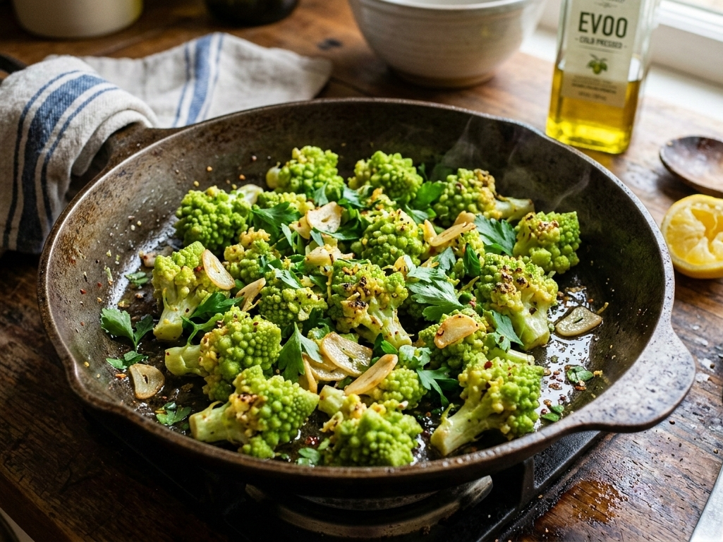 Heat olive oil in a pan, add sliced garlic, and toss in the Romanesco florets. Cook for about 6–8 minutes until they become tender but still vibrant green.